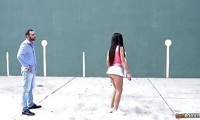 Striking tennis player with enormous milk cans agrees to rough pounding at the field