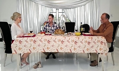 Evelin And Seth Sharing Big Chisel In Kitchen On Thanksgiving